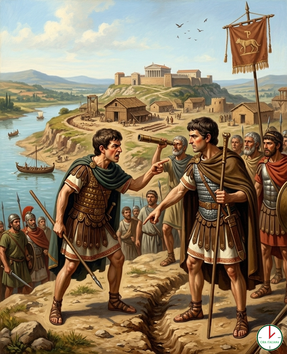 Si affidano agli auguri, l'osservazione del volo degli uccelli. Remo vede sei avvoltoi sul Colle Aventino, ma Romolo ne vede dodici sul Palatino. La disputa è violenta. Romolo inizia a tracciare il Pomerio, il confine sacro e invalicabile della città, scavando il solco primigenio. Remo, per scherno e per sfidare l'autorità del fratello, salta il solco. È il sacrilegio supremo. Romolo, infuriato, lo uccide.